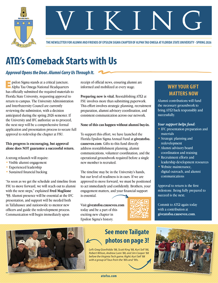 Recolonization: This committee will work with the ATO National Headquarters and FSU to plan the return of our chapter. This committee will also help support and advise new members as they begin rebuilding the chapter.